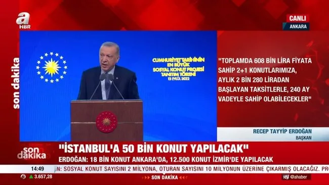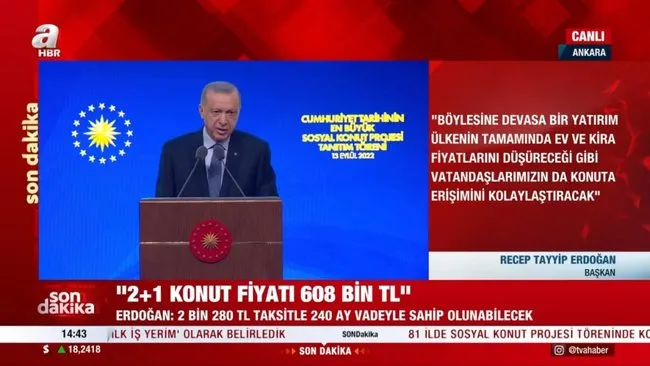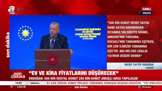 Birazdan ana hatlarını milletimizle paylaşacağımız projenin başvuruları yarın başlıyor ve ekim ayının sonuna kadar sürecek. Bu kampanya sayısı ve kalitesi bakımından dünyadaki en büyük konut yatırımını ifade etmektedir. Sosyal konut projesini 2 yıl içinde tamamlamayı hedefliyoruz.