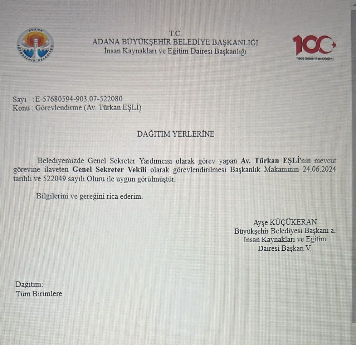 Halisçelik’in mesajının üzerinden çok kısa bir süre sonra Adana Büyükşehir Belediyesi’nde yeni genel sekreter ataması yapılana kadar makama vekalet edecek kişi belli oldu.