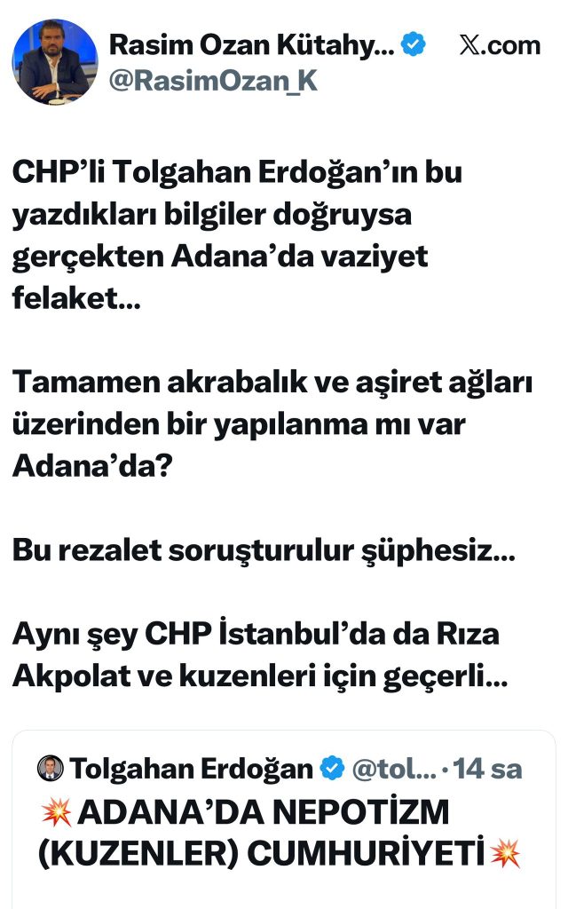 “CHP’li Tolgahan Erdoğan’ın bu yazdıkları bilgiler doğruysa gerçekten Adana’da vaziyet felaket…