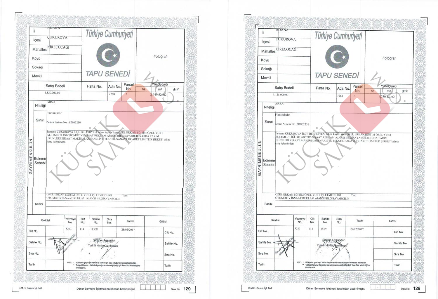 Çukurova ilçesi Kireçocağı Mahallesi’nde biri 2649.52 metrekare, diğeri ise 1750.48 metrekare olan yan yana iki arsa, metrekaresi ortalama 665 liradan Özel Erkan Eğitim Kurumlarına satıldı. 2 arsananın 28 Şubat 2017 tarihinde satıldığı öğrenilirken, satış işleminin hangi usulle yapıldığı ve arsaların imar planında kaç yoğunlukta olduğu öğrenilemedi.