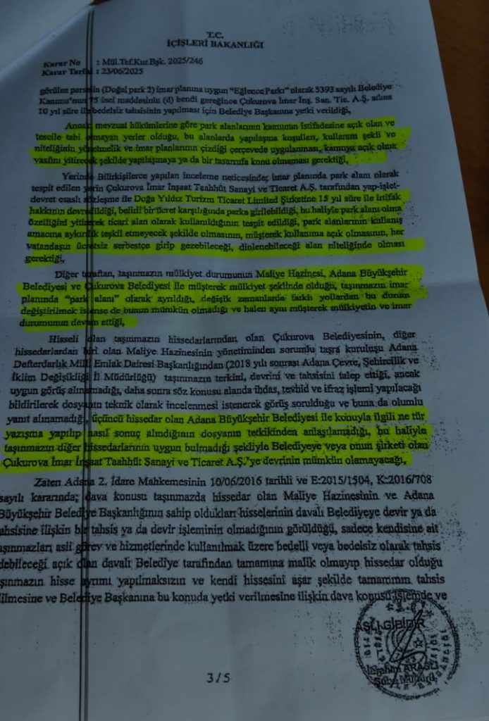 Yine aynı raporda Çukurova Belediye Meclisinin 06.03.2015 tarihli sayılı kararı 100.Yıl mah. 7637 ada 3 parseldeki 33.047 metrekarelik 1/1000 ölçekli ve İmar planında ‘’ Botanik Bahçe ve Doğal Park’’ olarak görülen parselin (Doğal Park 2) imar planına uygun ‘’ Eğlence parkı’’ olarak 5393 sayılı Belediye kanunun 75. Maddesinin (d) bendi gereğince Çukurova İmar İnşaat.San. Tic. A.Ş adına 10 yıl süre ile bedelsiz olarak tahsisinin yapılması için Belediye Başkanına yetki verildiği,