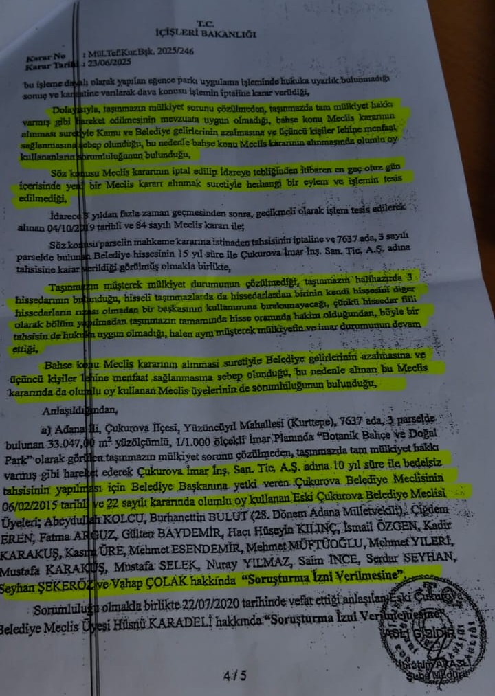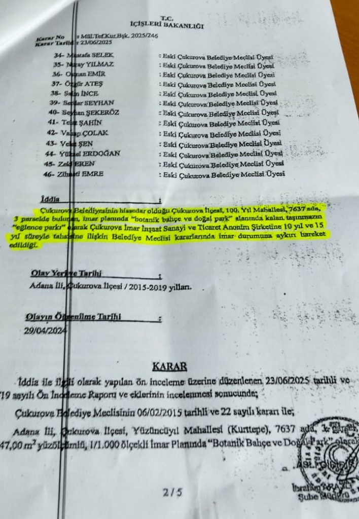 Çukurova Belediyesinin hissedar olduğu Çukurova ilçesi,100 Yıl Mahallesi,7637 ada 3 parselde bulunan ve imar planında ‘’ Botanik bahçe ve doğal park’ alanında taşınmazın ‘’ eğlence parkı’’ olarak Çukurova İmar İnşaat Sanayi ve Ticaret Anomim Şirketin 10 yıl ve 15 yıl süre tahsisine ilişkşn Belediye Meclisi kararlarında İmar durumuna aykırı hareket edildiği tespit edilmiştir.