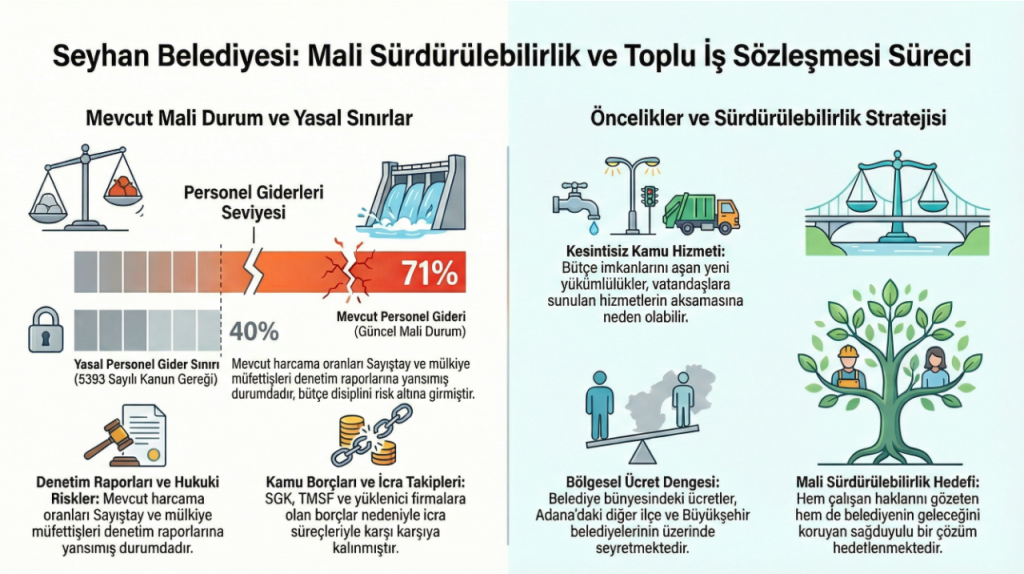 Seyhan Belediyesi açıklamasında, kamu hizmetlerinin kesintisiz sürdürülebilirliğinin esas alındığı belirtilerek, çalışan haklarını gözeten ve mali dengeyi koruyan bir anlayışla sürecin yürütüldüğü vurgulandı.